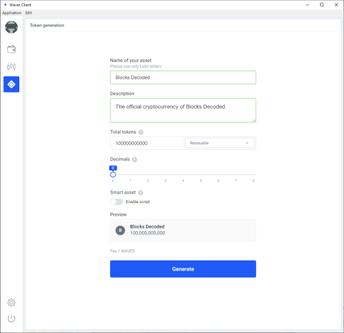Теперь пришло время создать вашу собственную криптовалюту! Жмем Generate . Вы должны принять предупреждения о криптовалюте Waves. После того, как Waves подтвердит вашу криптовалюту, вы готовы!