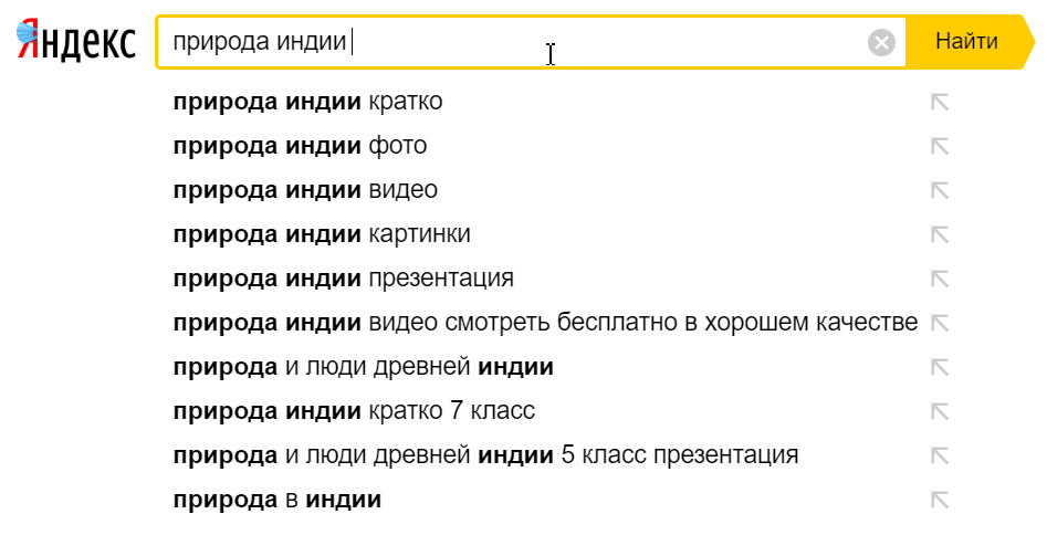 При написании текста нужно выбирать слова, которые часто вводят пользователи. Вы можете найти популярные выражения с помощью подсказок — их можно получить и без Key Collector. Для этого просто вводим в поисковой строке интересующий запрос и смотрим, что предлагается: