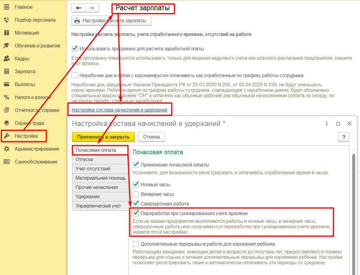 В 1С:ЗУП возможен автоматический расчет переработок. В подменю «Расчет зарплаты» раздела «Настройки» выбирается пункт «Настройка состава начислений и удержаний». Учет сверхнормативных часов производится после выбора опции «Учитывать переработки при суммированном учете» вкладки «Почасовая оплата».