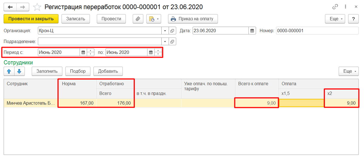 Суммы, начисленные за переработки, отражаются в документах «Начисление зарплаты и взносов».